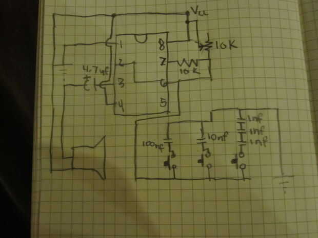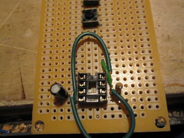 Conecte el zócalo del IC o IC (si no está utilizando una toma de corriente) a la Junta. Conectar el pin 2 y 6, 4 y 8. conectar el pin 1 a tierra y pin 8 a fuente de alimentación. conectar el pin 7 y 6 resistencia de 10 k. Conecte el extremo de tierra del condensador 4.7 uf a la clavija 3.