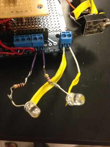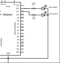 A continuación, permite poner en los LEDs. LEDs son diodos, así que asegúrese de que se enfrentan a la manera correcta! Tenga en cuenta que usted no necesita utilizar el mismo LEDs de color utiliza, pero diodos LED tendrá resistencias de diferentes tamaños. Para mi caja, utilicé un LED blanco con un 4.7KOhm resistor y un ámbar LED con un resistor de 1KOhm. El final (largo) positivo del LED blanco va en la resistencia al pin digital 12, y su lado negativo va a tierra. El otro LED está conectado de la misma manera, pero para pin digital 11 en lugar de 12.