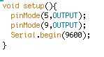 He utilizado los pines analógicos como salidas, asi juego pines 5 y 9 como salidas de Arduino. Configurar Serial.begin para que pudiera imprimir los valores entrantes mientras que la solución de problemas.