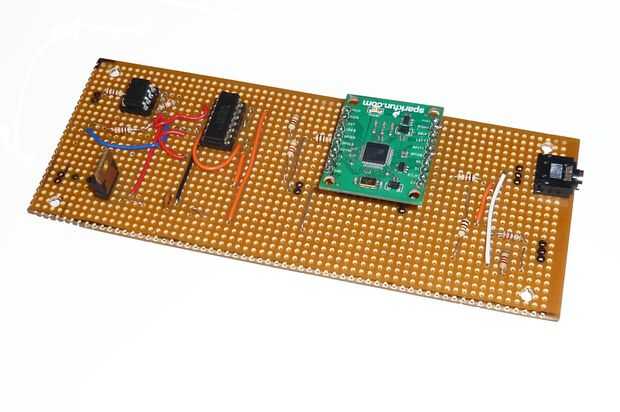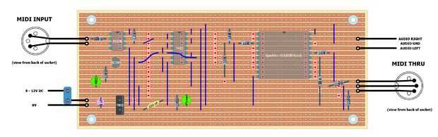 Aquí es el diseño de la placa perforada para el proyecto. Si no puede conseguir los conectores y cabezales de perno para el montaje de la Junta de rotura de VS1103 a la placa de circuito principal - no se preocupe, puede hacer lo que hice y sólo tiene que utilizar un alambre en su lugar. En segundo lugar, usted puede notar que no incluyo el transistor para el LED de actividad MIDI. El LED funcionará, pero no se encenderá para arriba tan brillantemente.