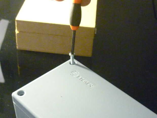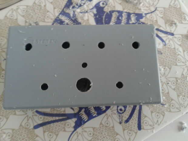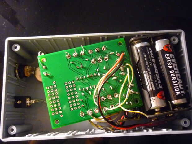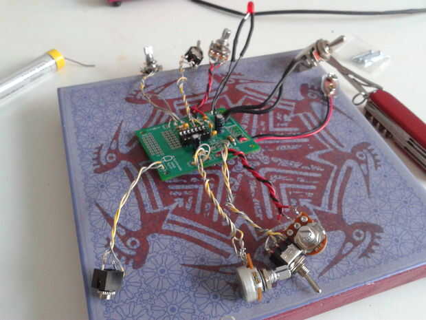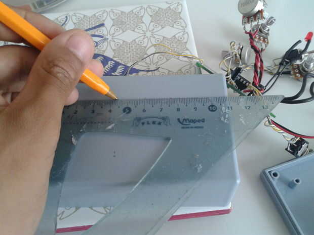 Una vez que todos los componentes soldados a subir, te recomiendo el sintetizador de la vivienda. Compré una caja de proyecto y luego perforar diferentes orificios con el taladro. Hice 8 agujeros en el frente de la caja: cuatro potenciómetros, el LED rojo, dos interruptores para encender y apagar cada oscilador y un interruptor para activar o desactivar el el sintetizador. Y en el lado de la caja: el audio conector hembra y el dc jack. Una vez después de hacer los agujeros empuje todo dentro. Tenía la batería que casi no cabía dentro, realmente tuve que usar mi dremel para cortar piezas de plástico para todo, para adaptarse.