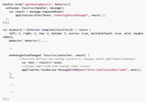 La parte analógica de entrada se incluye para mostrar lo fácil que es incluir una entrada de hardware, y afectan las operaciones de alguna pieza de hardware, como la salida de audio. Si no tienes un Kinoma crear o potenciómetro práctico, puede utilizar el simulador del dispositivo y analógico para ver cómo se comporta. En este proyecto, tenemos la entrada analógica ajuste la amplitud de salida (volumen). Sin embargo, usted podría fácilmente cambiar para ajustar la frecuencia de salida, así, o hacer algo más, junto a la creación sonora.