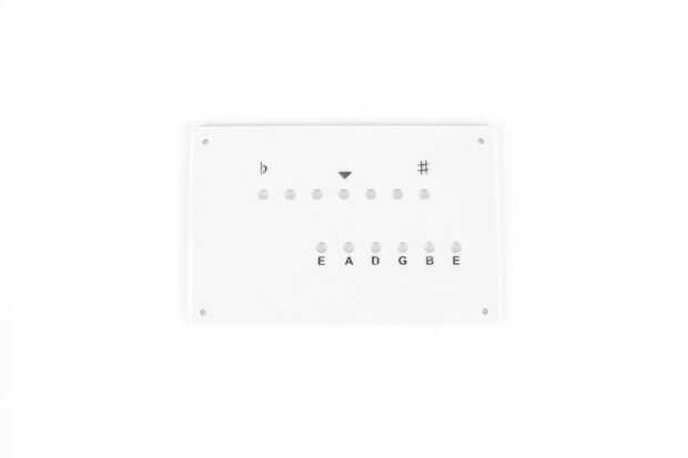 Si no tienes un cortador láser, puede utilizar la tapa normal para el gabinete y perfore los agujeros. Uso un 13/64" taladrar broca y taladro de seis para el LED que indica que de las seis cuerdas diferentes es ser afinado y siete agujeros para los LEDs que indica lo aguda o plana de la cadena es. Etiqueta conjunto de seis agujeros con E, A, D, G, B y E de izquierda a derecha. El orificio central de la serie de siete con un triángulo apuntado hacia el agujero de la etiqueta. El agujero de la derecha con el símbolo musical de sharp y el agujero de la izquierda con el símbolo musical para el plano de la etiqueta.