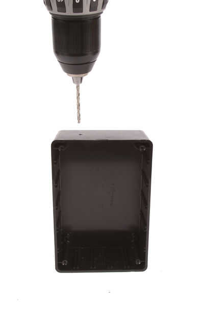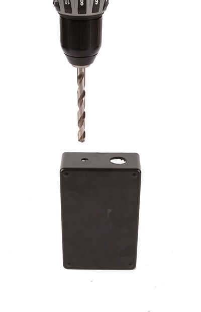 Taladre un agujero de arranque en el lado de su recinto con una 1/8 broca. Perfore el agujero de arranque utilizando una pala 13/16 bit para crear un agujero más grande para el interruptor SPST. El interruptor de balancín servirá como un interruptor on/off para el sintonizador.