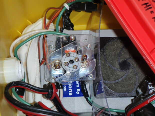El canal del timón del receptor está reservado para accionar interruptores de alta tensión que serán físicamente desconecte los motores de coche el conductor del Motor. Esta característica a prueba de fallos sólo se utilizaría en el caso de una probable falla catastrófica del conductor del Motor (que tienden a fallar a Full On). La segunda foto de abajo muestra esta característica del Motor. Los interruptores se montan en direcciones opuestas para que el accionamiento del servo situado entre ellos hace que ambos interruptores para mover a la posición OFF (u ON) al mismo tiempo.