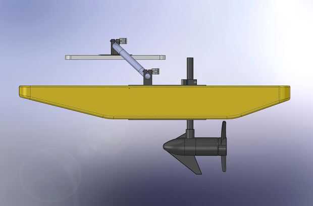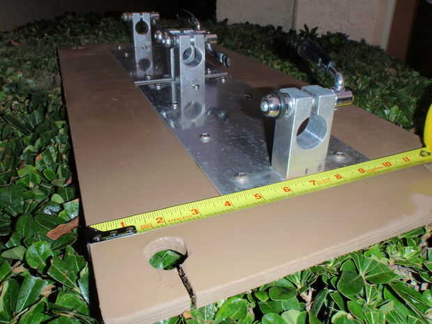 Placas de aluminio se atornillan a la espuma, superior e inferior, con pernos pasando por la espuma, para proporcionar una robusta base para unir al montar Motor y Outrigger Pole estaciones a. El CAD dibujo muestra el montaje del Motor separado del Outrigger Pole estaciones por cerca de 6 pulgadas. En el final desigh, esta dimensión se reduce a unas 3 pulgadas.