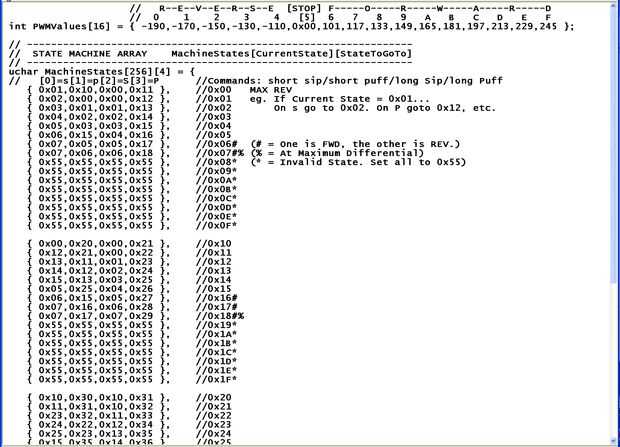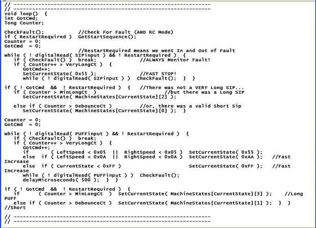 El primer segmento de código siguiente es la tapa de la mesa de la máquina de estado, y el segundo segmento de código es el operación todo el lazo! Hay solamente algunas otras funciones, se obtiene la secuencia de arranque de seguridad, una supervisa condiciones de falla y hombre al agua y otros los LEDs de control y envían comandos de velocidad que el conductor del Motor.