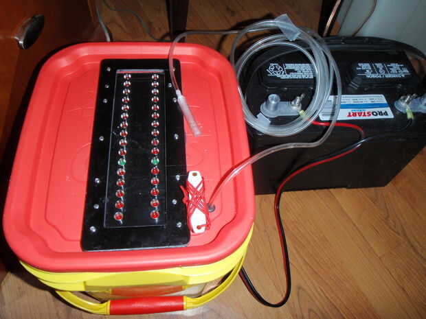 Había diseñado y construido el Panel del operador exactamente a los criterios descritos en el esquema, así que no entraré en mucho otros datos sobre ella en este momento, salvo para decir que usé una fresadora para precisamente perforar 32 LED en el panel negro de fibra de vidrio como se ve en las fotos, y el panel fue sellado a la tapa de la caja con masilla impermeabilizante suave. El diseño actualizado agrega LEDs adicionales para indicar la actuación del interruptor de SORBO y soplo. Todos los LEDs son de DigiKey (www.DigiKey.com), parte #s: rojo = SSI-LXR4815SRD, verde = SSI-LXR4815GD ($1,25 cada uno).