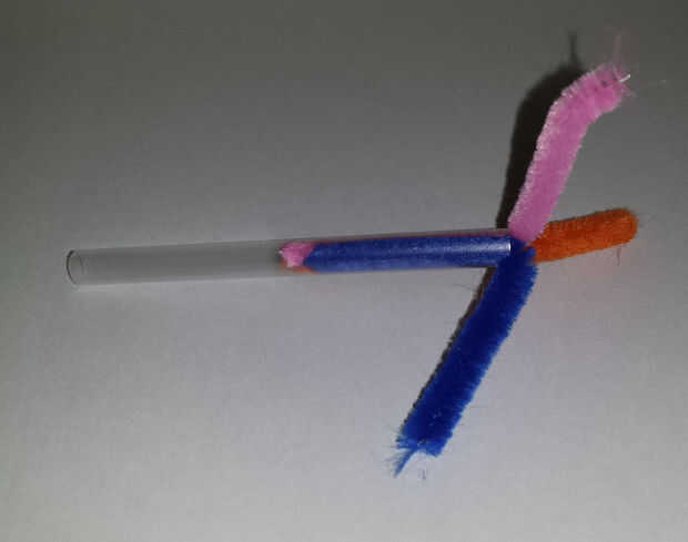 Sujete una pieza de paja y un limpiador de pipa y pida a los alumnos cómo podríamos utilizar estos juntos para construir algo. Los estudiantes probablemente sugiere poner el limpiador de pipa en la paja. Demostrar que el limpiador de pipa permanecerá en su lugar porque la superficie difusa está presionando contra la parte interior de la paja, que ayuda a mantenerlo allí. (se puede definir esto como "tensión" si lo desea)