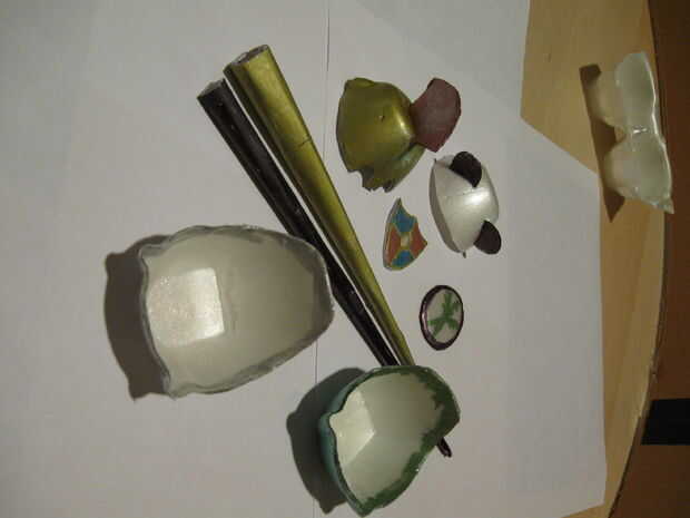 Corte el cartón de huevo. Hacer 2 sillas, 2 cascos y 2 escudos. Rollo de papel alrededor de un palillo de dientes para hacer las lanzas. Entonces saque sus marcadores metálicos y decorar. Cualquier forma se ve bien con marcador metálico!