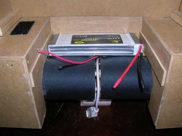Crea un espacio seguro para un paquete de baterías LIPO en el corazón de la rover y se aseguró que había no hay clavos, tornillos, etc. que podría moverse y spike el paquete. Conectores Tamiya fueron utilizados otra vez para conectar en el interruptor de fusible principal.
