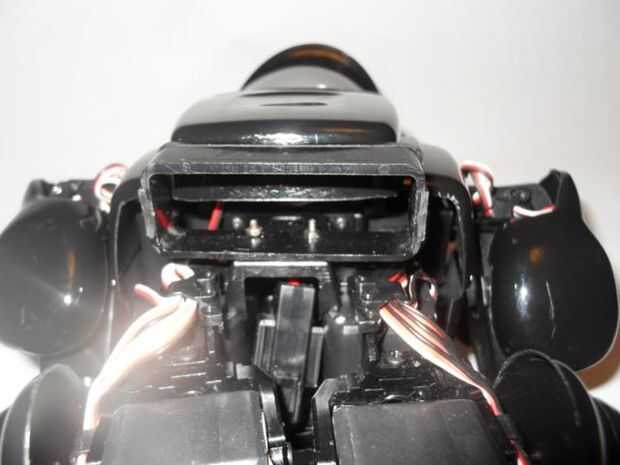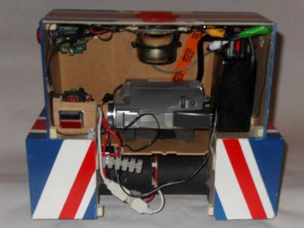 Me compré una cámara de tarjeta color día/noche que asomó por un agujero en la parte delantera de la silla, esto se llevó a cabo con un soporte flexible para que pudiera ajustar su ángulo. La salida fue alimentada, junto con la salida de la línea del discurso, a la videocámara DV. Un cable de alimentación regresó al carril de alimentación principal de los facinerosos.