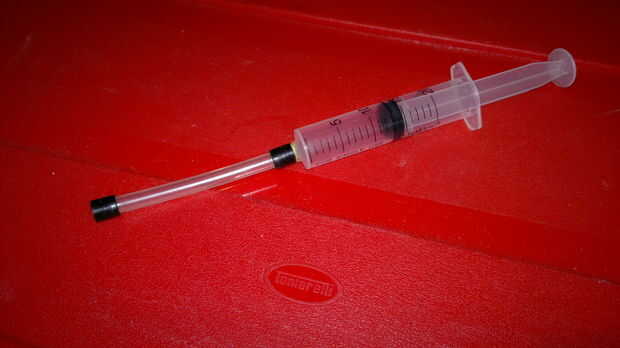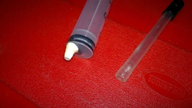 Prendiamo l'attaccatutto e stendiamone un filo sottile sul nastro di teflón avvolto en precedenza ed salida di una pues del tubo di gomma; attendiamo qualche istante la colla asciughi (deve diventare opaca) e dopo aver passato un'altro strato di colla facciamo aderire le due parti.