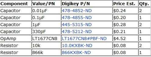 -Tablero: Si no consigues un protoboard incluido en un kit, haz uno como hemos utilizado para construir el amplificador. $5. -Componentes electrónicos: para el circuito amplificador, compramos los componentes eléctricos de Digikey. Las cantidades a continuación son lo que usted necesita para construir un sismógrafo. Ordenamos unos extra de todo, sin embargo, en caso de algo habían desordenado durante la compilación.
