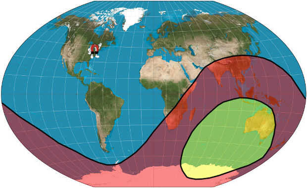 Aquí en Pennsylvania del este, no podemos ver los terremotos en la zona roja. Sólo seremos capaces de detectar las ondas P, (no S-agita) en la zona amarilla.