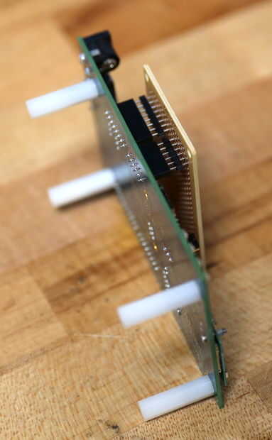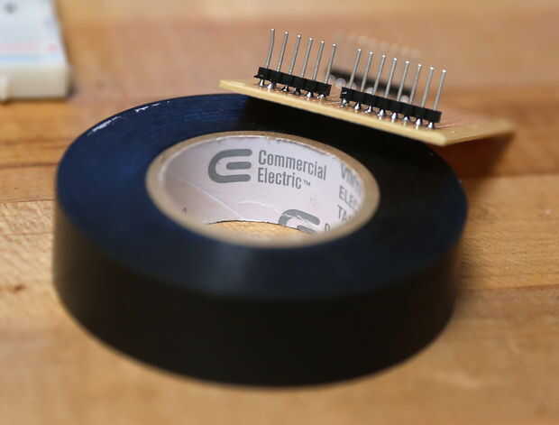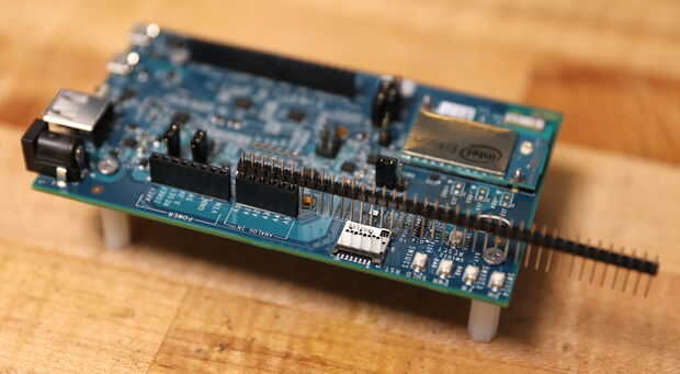 Primero hacer el escudo del circuito amplificador. Empuje pernos encabezado pines digitales 0 a 7 pines analógicos y pins de alimentación en la placa de expansión de Arduino de Edison. Encajar la protoboard en los pernos y soldadura de los pernos en la Junta. Esto puede ser un poco difícil.
