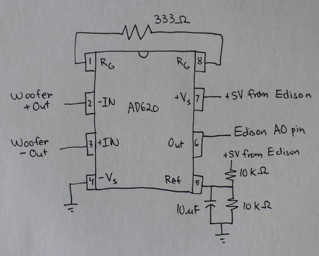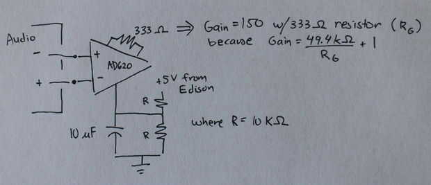 que se encuentra en la hoja de datosdel AD620. El circuito está sintonizado para tener una ganancia de 150, amplificando el seismometer salida del orden de 10 ^-1 amp.