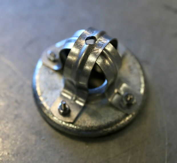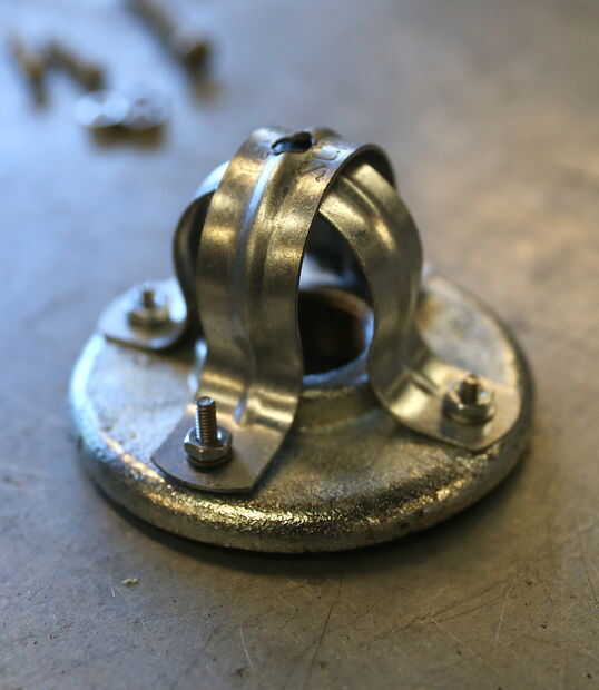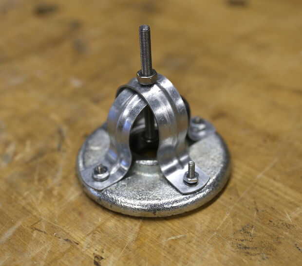 Finalmente, atornille una tuerca en un tornillo largo a dos pulgadas de su punto de gimlet. Voltee la placa y enrosque el tornillo a través de ambos soportes de tubería. Fijarlo abajo con la otra tuerca.