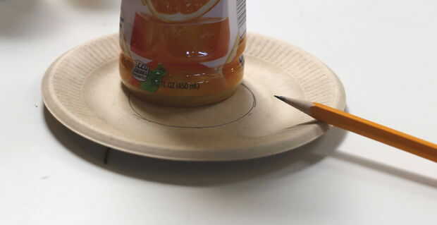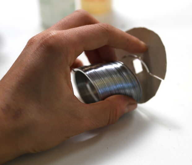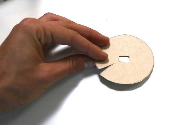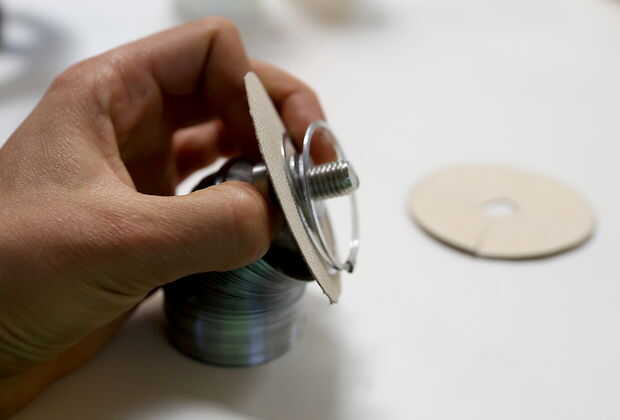 Dibuje dos círculos sobre un trozo de cartón (utilicé un plato de papel) con un diámetro ligeramente más grande que el diámetro de los furtivos. Cortar, cortar los agujeros en sus centros y corte ranuras en los lados. Tome un círculo e hilo del extremo del slinky a través de su ranura. El círculo debe ser cogido en dos vueltas de los furtivos. Desenroscar las piezas superior e inferior del peso y empuje arriba de peso (el lado con el tornillo) en un lado del círculo. Tome el segundo círculo de cartón y empuje a través del tornillo. Ahora dos vueltas del furtivo se intercalan entre dos círculos de cartón. Tornillo en la parte inferior del peso. Ambos círculos de cartulina para fijar el peso de la cinta.