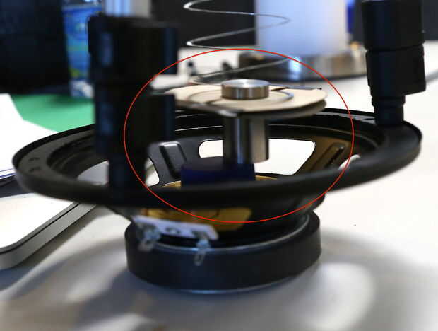 Sostenga el furtivo en el trípode y sobre el woofer a la altura que desee lo colgado. Mantenga una mano en la parte superior del slinky y el otro por debajo del peso. Permita que el peso lentamente extienda el furtivo manteniendo el peso catado en la mano. En su posición final cuando el resorte está completamente extendido, el peso debe casi tocar la tapa de plástico sin ejercer presión sobre ella o la araña del woofer. Si el furtivo es demasiado largo, manojo de bobinas más en la parte superior de tu mano. Si es demasiado corto, suelte algunas bobinas para extender su longitud.