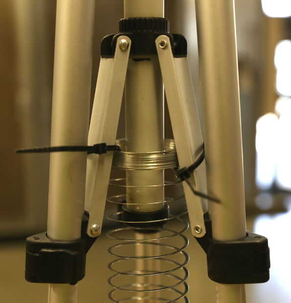 El extremo libre de la furtivo se unirá a la parte superior de las piernas interior del trípode. Sin embargo, el furtivo se colocará tal que, cuando está totalmente extendido, su peso se mantiene justo por encima de la tapa de la botella de agua plástica.