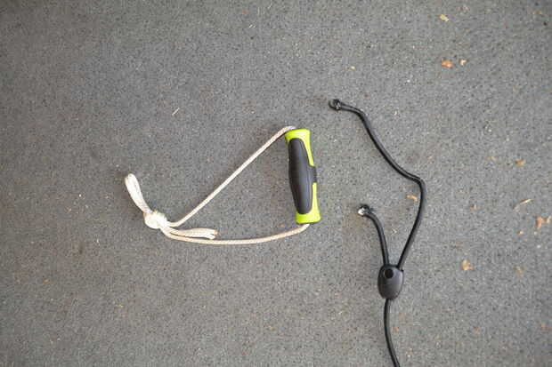 2 - manijas. Sacrifiqué una vieja banda de resistencia. PVC probablemente sería trabajar, pero asegúrese de que los bordes son redondeados para que no cortaban el cordón.