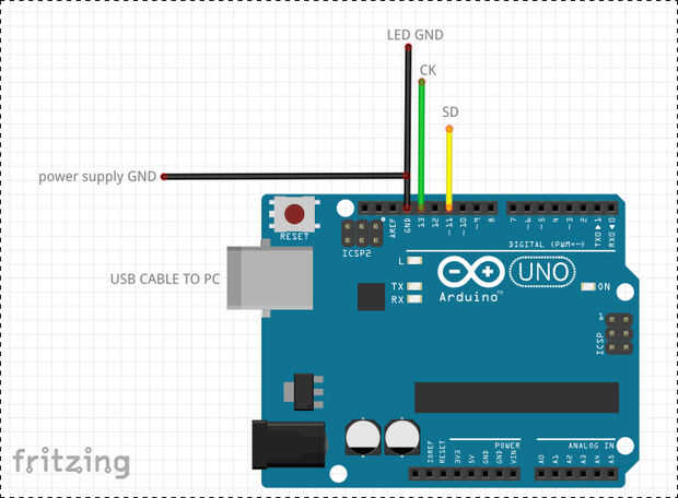 la ws2801 tiene 4 cables para ser conectado, vamos a empezar con la tierra, tierra de la tira led GND de arduino y fuente de las energías tierra, muy importante para evitar el parpadeo.