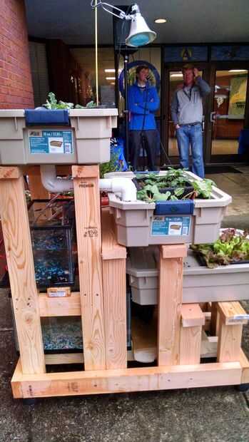 AcuaponiaAquaponic combina la acuicultura (cultivo de pescado) con hidroponía (cultivo de plantas en agua). Excretar el pescado se descompone por las bacterias a nitratos que son absorbidos por las plantas como nutrientes y ley de raíces de la planta