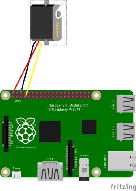 Por favor comprueba si es seguro para el control de 5 voltios del perno en la Raspberry Pi 2 (RPi). ¡Ten cuidado! Puede dañar fácilmente su RPi si dibuja demasiado actual en un alfiler. Por lo tanto, si no está seguro acerca de la corriente los requisitos actuales de su Servo, sólo energía de una fuente de voltios 5 diferente a uno de sus pernos de RPi y conectar la tierra a la RPi GND. En nuestro caso podemos poder con seguridad el servo desde el pin 2 del PRI. Con el fin de conectar el servo. Con este servo, el negro es el cable a tierra, el cable rojo es de 5 voltios y el cable amarillo es el control. Cada servo tiene sus propias características. En general es la misma que en este caso pero usted debe comprobar fuera de la hoja de datos de tu servo antes de comenzar. Consulte el esquema que muestra cómo hemos conectado nuestro servo.