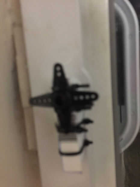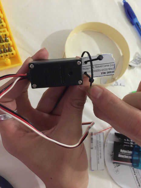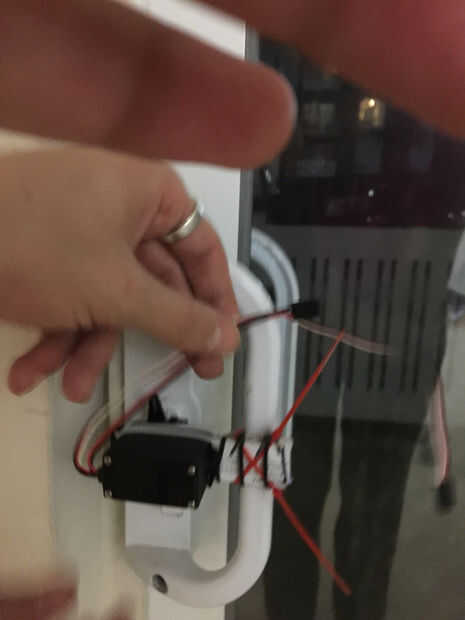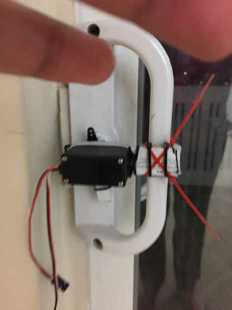 El motor servo se necesita para hacer funcionar el pomo. extendemos el servo con una paz de arreglos de madera con ataduras de cremallera se fija en el mango. fijamos el cuerno a la vuelta de pulgar con ataduras de cremallera. y conectar el servo a la corneta. Consulte las fotos para más detalles