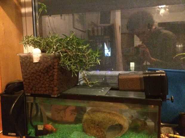 Para el inconsciente, un sistema de acuaponia es uno en el que los peces son alimentados, entonces el agua de las bombas de hábitat de peces a través de un recipiente en el que plantas crecen, las plantas en el recipiente utilizan los residuos de pescado en el agua como nutrientes y crecen mientras tanto limpiar el agua y actúa como un sistema de filtración natural, que vuelve el agua a la pecera , limpia y lista para comenzar el ciclo de nuevo. Para hacerla autosuficiente agregué un alimentador automático que había dejado de deslizadores pintados rojo teníamos (tenemos liberta).