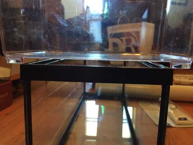 En primer lugar, presentar hacia abajo de las patas del tanque más pequeño para que ajuste cómodamente encima de la pecera.