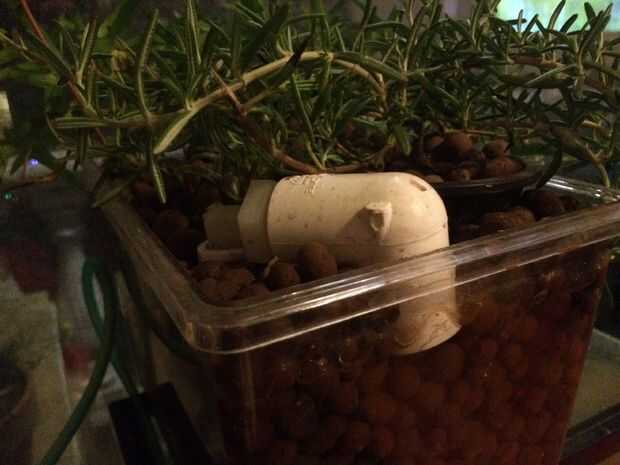 La botella de agua (yo usé un resorte de Polonia o similar), recortas la parte superior 1/3 de (lo que le da una altura apenas mayor que su tubo de salida del PVC de 1" y luego cortar las aberturas en los lados para permitir que agua en pero aún pequeño bastante para impedir que está al lado de la tubería de toma PVC hydroton (flujo constante requiere su salida realmente tirar agua fuera del sistema , tener raíces hydroton o planta tocando directamente el tubo de salida pudiera causar obstrucción... y luego agua desagradable salpicado en el piso). Puede utilizar prácticamente cualquier cosa para proteger su tubo de salida.