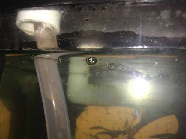 Para la ingesta, pegué en la tubería de 1" PVC que llevó a cabo dentro de ella 1/2" tubo de goma de la bomba de agua, que luego junto con una 1/2" a 1" pieza de esquina de convertidor que conectado a un 1" pieza de PVC de la esquina (que quería el agua para acabar pasando hacia abajo para evitar cualquier salpicadura).