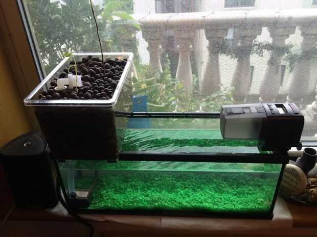 (1) la tubería de entrada donde el agua se bombea en el tanque de peces (salidas por encima de la línea de agua);