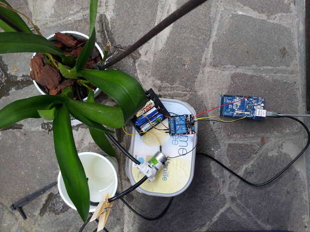 Para poder utilizar la energía de la bomba es necesario que no sea pagadero directamente dall'Arduino; De hecho, este dispositivo es capaz de entregar una corriente de poco más de una décima de amperio y salida voltajes del orden de 5 V. La bomba requiere de al menos 6 V y una corriente de poco más de amperaje. Por esta razón es necesario utilizar las 4 pilas de 1,5 V, que permiten para obtener una tensión de 6 V y la solicitud actual. El cable rojo del portapilas, la bomba estará conectado al ánodo y el cátodo se conecta al relé a través de un cable; Este dispositivo se conectará al cable negro de la batería, que será nuestra Misa. El relé estará conectado a través de Arduino con 3 cables, VCC, GND y entrada, que estará conectado al pin 9.