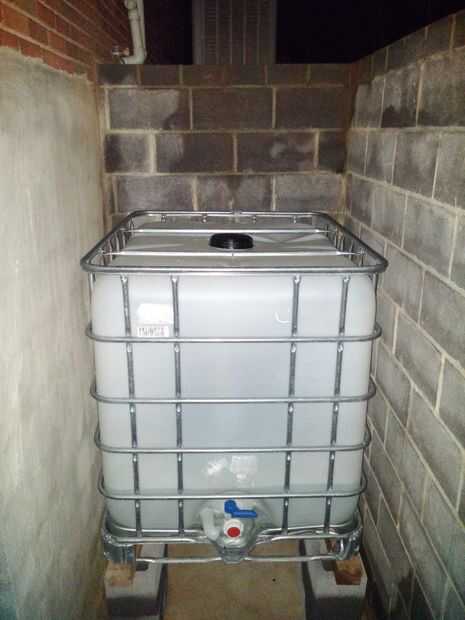 Mayoría de los sistemas requiere el suelo para estar preparados para soportar el peso del tanque en este punto. Por suerte, el tanque en este proyecto se encuentra en una superficie de hormigón. However, a simple riser is used to allow for easier access to the output port on the 300-gallon IBC tank (Repurposedmaterialsinc.com, 2015). Esto fue creada mediante la colocación de grupos de dos bloques en cada esquina de la canalización vertical y dos 2x4s apilado doble para ayudar a soportar el peso medio. El tanque se coloca directamente sobre las tablas.