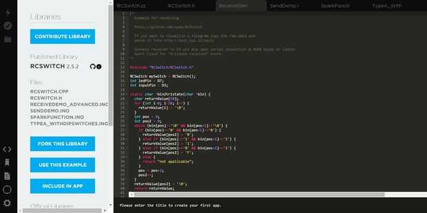 Después preparar las conexiones ahora es el momento para trabajar en el código. Ir a la partícula construir Página y firmar. En el lado izquierdo, se puede ver la ficha bibliotecas búsqueda de la biblioteca "RCSWITCH". Arriba encontrarás un ejemplo .ino del archivo llamado "RECEIVEDEMO_ADVANCED. INO". Cuando se abre, puede ver el código en el terminal. Después de hacer clic en botón de uso en este ejemplo, cambie el código siguiente en la línea 65;