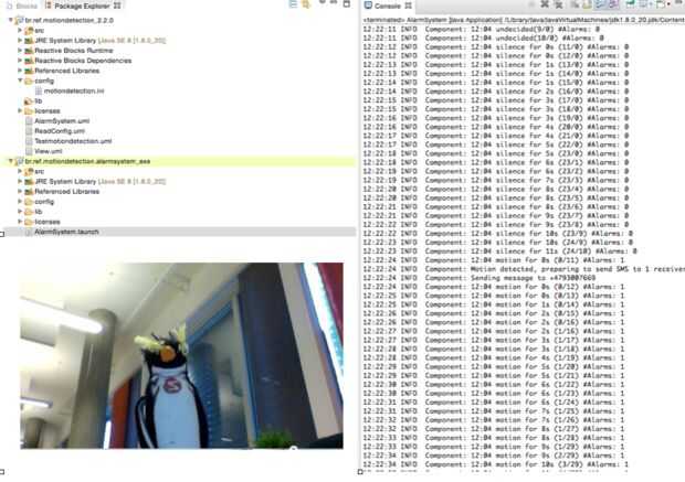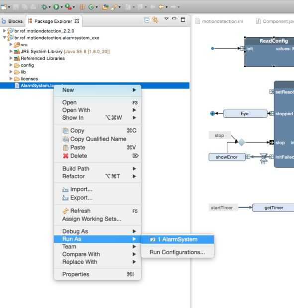 Ahora puede ejecutar el proyecto generado. En la vista Explorador de paquete del proyecto generado _exe, haga clic con el botón derecho AlarmSystemSMS.launch RunAs y seleccione seleccione AlarmSystemSMS.