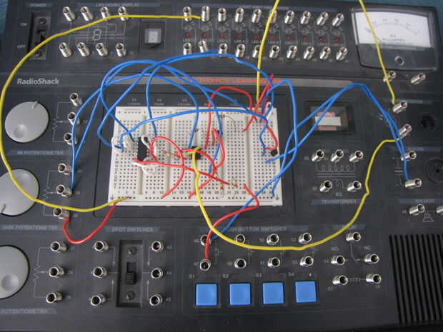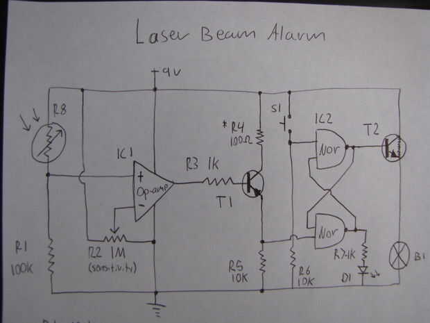 hice este circuito basado en dos circuitos básicos, un comparador de op-amp y un pestillo de la puerta NOR. El principio básico (en lenguaje electrónico) es que R2 establece el voltaje de referencia, mientras que la fotorresistencia y R1 crean la tensión de entrada. Originalmente, la salida del op-amp es alta cuando la fotorresistencia está iluminado, pero el transistor PNP invierte esto y permite que la señal a bajo para el pestillo. Yo pude han cambiado las entradas del amplificador operacional también pero por alguna razón que esto no funciona. Con la salida invertida, cuando el fotoresistor es oscuro, la salida del seguro es alta. Esto permite que activará el zumbador o cualquier otra alarma no importa si la fotorresistencia es oscuro o iluminado. S1 se restablece el circuito de cierre sólo si el fotoresistor es iluminada. Puede utilizar una llave para este propósito tan sólo se puede restablecer.