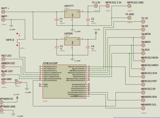 El MPU6050 es un dispositivo I2C y tan sólo necesita conexiones SDA y SCL a la ATmega328p que pueden encontrarse sobre los pasadores del 27 y 28. Este dispositivo es alimentado de 5V mismo que debemos proporcionar el ATmega328p con, y como tal un regulador de voltaje de 5V LM7805 proporciona esto.