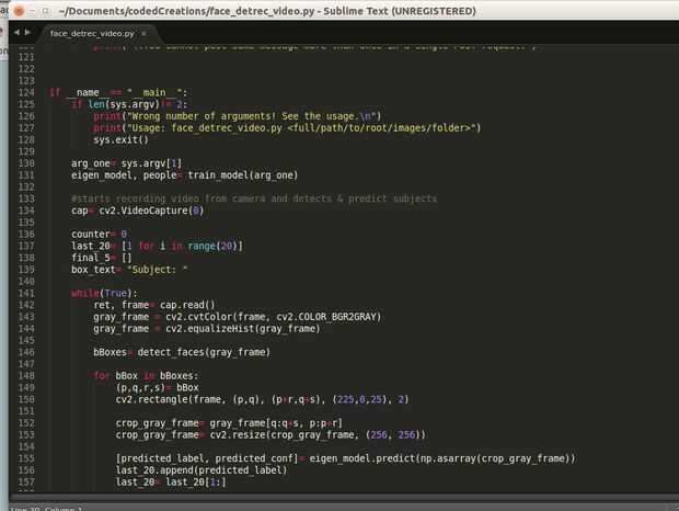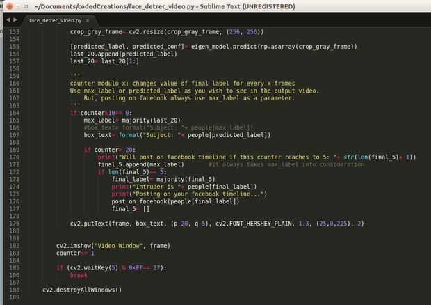 if __name__== "__main__":<br> if len(sys.argv)!= 2: print("Wrong number of arguments! See the usage.\n") print("Usage: face_detrec_video.py <fullpath to root images folder>") sys.exit() arg_one= sys.argv[1] eigen_model, people= train_model(arg_one) #starts recording video from camera and detects & predict subjects cap= cv2.VideoCapture(0) counter= 0 last_20= [1 for i in range(20)] final_5= [] box_text= "Subject: " while(True): ret, frame= cap.read() gray_frame = cv2.cvtColor(frame, cv2.COLOR_BGR2GRAY) gray_frame = cv2.equalizeHist(gray_frame) bBoxes= detect_faces(gray_frame) for bBox in bBoxes: (p,q,r,s)= bBox cv2.rectangle(frame, (p,q), (p+r,q+s), (225,0,25), 2) crop_gray_frame= gray_frame[q:q+s, p:p+r] crop_gray_frame= cv2.resize(crop_gray_frame, (256, 256)) [predicted_label, predicted_conf]= eigen_model.predict(np.asarray(crop_gray_frame)) last_20.append(predicted_label) last_20= last_20[1:] ''' counter modulo x: changes value of final label for every x frames Use max_label or predicted_label as you wish to see in the output video. But, posting on facebook always use max_label as a parameter. ''' if counter%10== 0: max_label= majority(last_20) #box_text= format("Subject: "+ people[max_label]) box_text= format("Subject: "+ people[predicted_label]) if counter> 20: print("Will post on facebook timeline if this counter reaches to 5: "+ str(len(final_5)+ 1)) final_5.append(max_label) #it always takes max_label into consideration if len(final_5)== 5: final_label= majority(final_5) print("Intruder is "+ people[final_label]) print("Posting on your facebook timeline...") post_on_facebook(people[final_label]) final_5= [] cv2.putText(frame, box_text, (p-20, q-5), cv2.FONT_HERSHEY_PLAIN, 1.3, (25,0,225), 2) cv2.imshow("Video Window", frame) counter+= 1 if (cv2.waitKey(5) & 0xFF== 27): break cv2.destroyAllWindows()