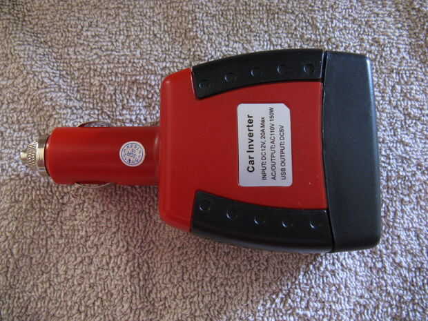 Para alimentar o cargar un ordenador portátil o tablet u otro dispositivo similar tendrá que utilizar un inversor. El que se muestra a continuación proporciona 150 vatios y es suficientemente grande para este pequeño sistema. Cuesta $10 en buena ol ' Ebay.