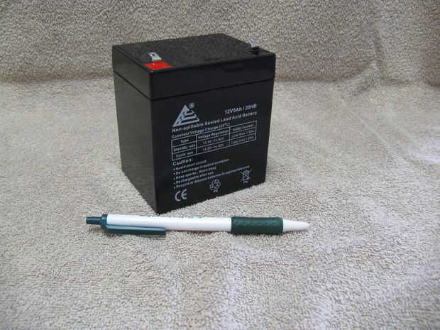 Para aumentar la capacidad de almacenamiento, compré una pequeña batería de 12 voltios sellada de plomo ácido. Es 5 amperios horas (5000 mAh) y cuesta 13 $ en Ebay. Mide aproximadamente 3.5 x 2.5 x 4 pulgadas y pesa dos libras probablemente. Se puede fácilmente energía algunas luces de LED o un radio y, con un inversor de energía un ordenador portátil por un tiempo. Y, por supuesto, cargar el teléfono unas cuantas veces.