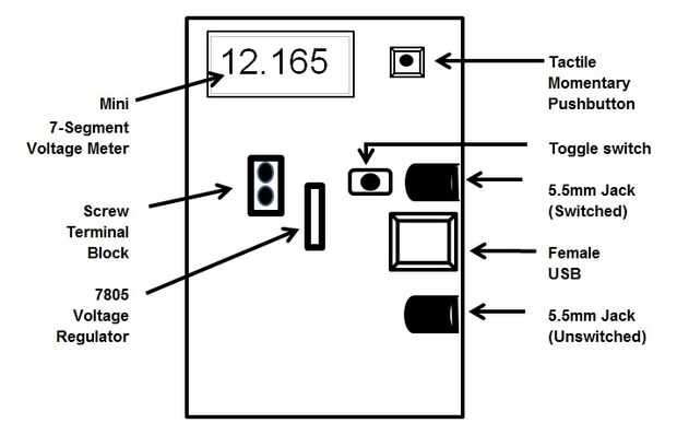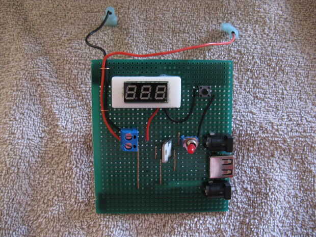El interruptor momentáneo enciende el voltímetro y el LM7805 regula el puerto USB de 5 voltios al igual en el Whistler. Lo único que esto no tiene que un comercial no es una linterna, pero hay un montón de barato poco luces USB que funcionan. Construí un cable de 5,5 mm BC macho en un extremo y un conector EC-5 en el otro que podía utilizar los cables de puenteo del Whistler con esta batería si quiero.