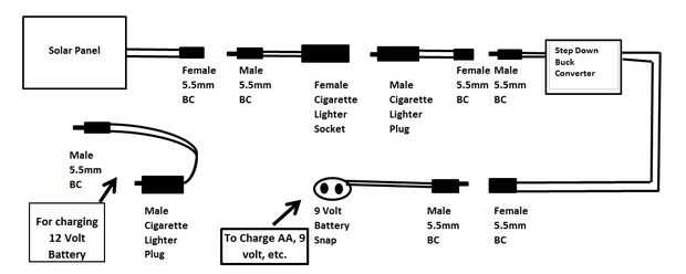 Aquí es un diagrama de todo solar setup carga. Es un poco exagerada como que he insertado una encendedor macho/hembra en el medio, pero lo hice así para poder utilizar el cargador de coche del Instant y para hacerlo más versátil.