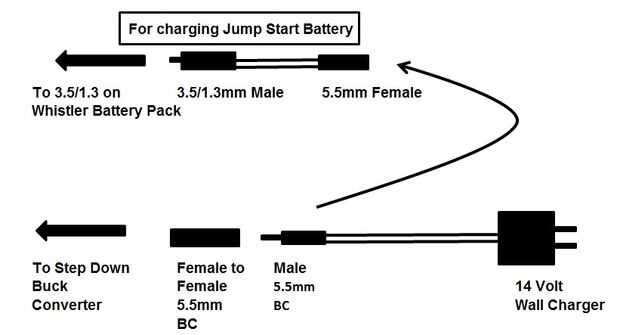 Cargador de pared y el cargador de coche para el Whistler vinieron con un 3.5/1.3 mm conector de barril, pero quería todo con 5.5 mm, así que reemplacé los extremos de ambos cables con los conectores machos de 5.5 mm. Esto requería comprar un 5,5 mm hembra a 3.5/1.3mm macho Adaptador para cargar la batería de Whistler.