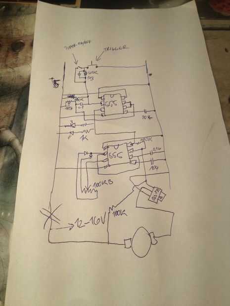 Aquí pongo LM7805 que no es en el esquema para ejecutar 555s así que más tarde pude energía de cualquier cosa entre 7-20V (supongo 20V es el límite del motor). También monoestable 555s-hora es sensibles a la tensión.