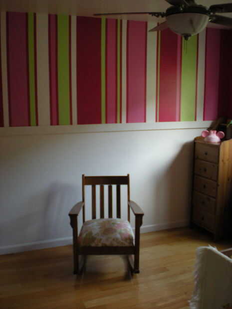 Después de recibir el riel de montaje, preparación para la pintura y llegar a ella. Utilizamos el carril como una moldura de carril de la silla para dividir la pared. Recuerde que si pintas el interior del bisel, tendrá que secar por una semana o más antes de colgar algo de ella, caso contrario la pintura con se adhieren al objeto que cuelga y va ser pegado en su lugar (que es la experiencia hablando... dos días no fue suficiente). Con el bisel de 45 grados, sin embargo, honestamente no puedes decir si el interior del bisel pintado en todos a menos que usted ponga su cara contra la pared.