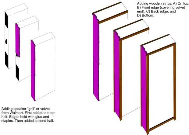 El diagrama hará un poco más de sentido. Las izquierda tres cajas muestran cómo he añadido a la tela de terciopelo. Tres cajas de la derecha, cómo se añadieron los listones de madera.